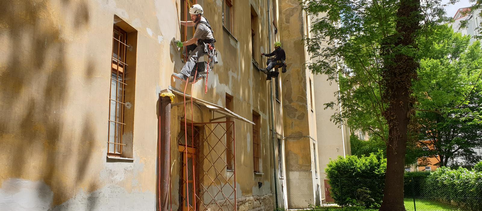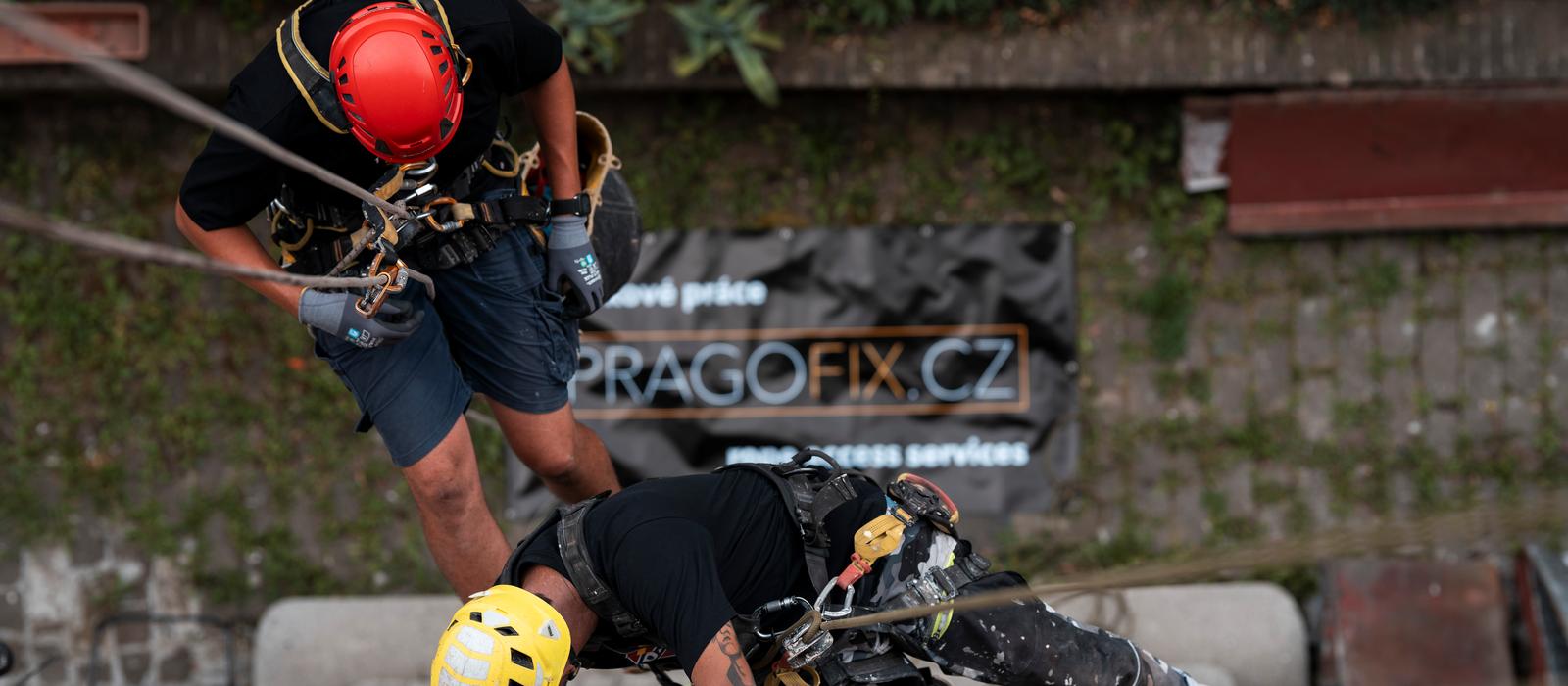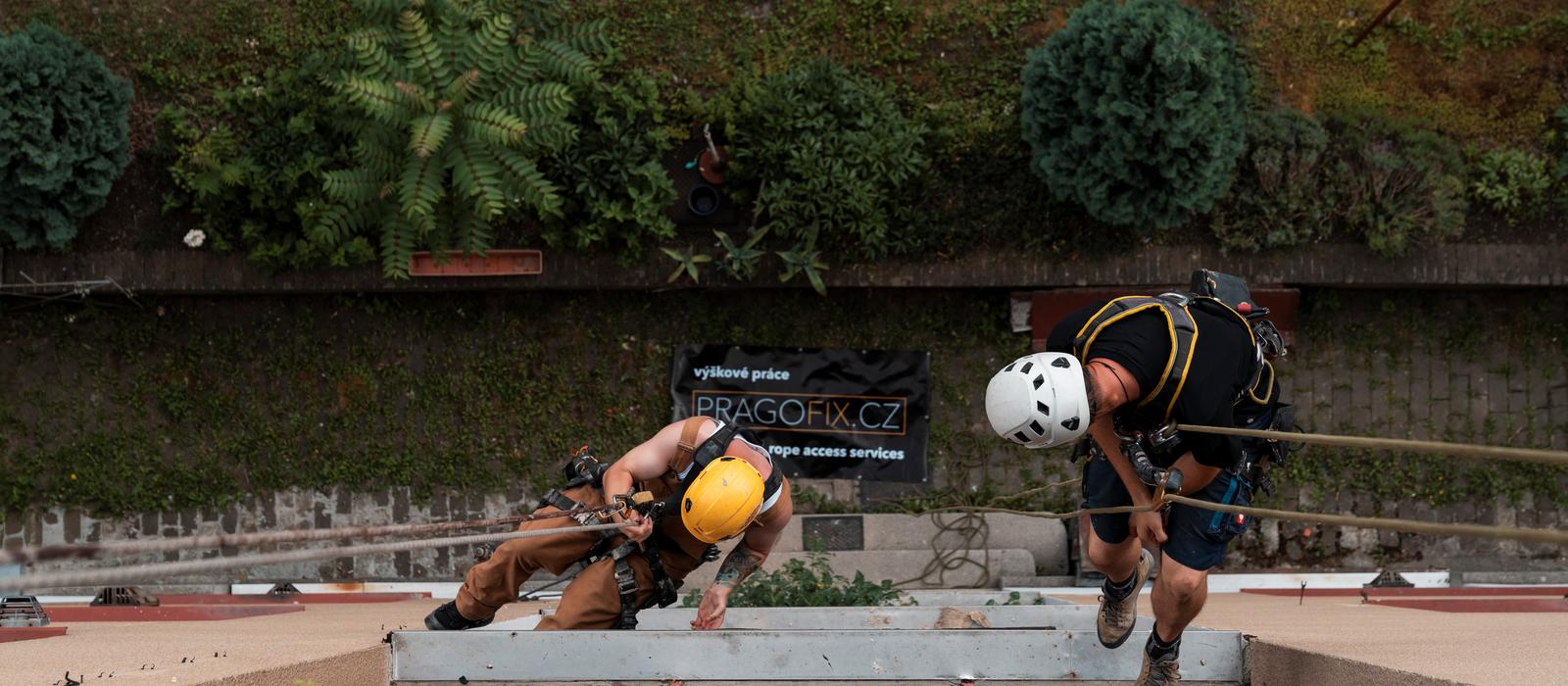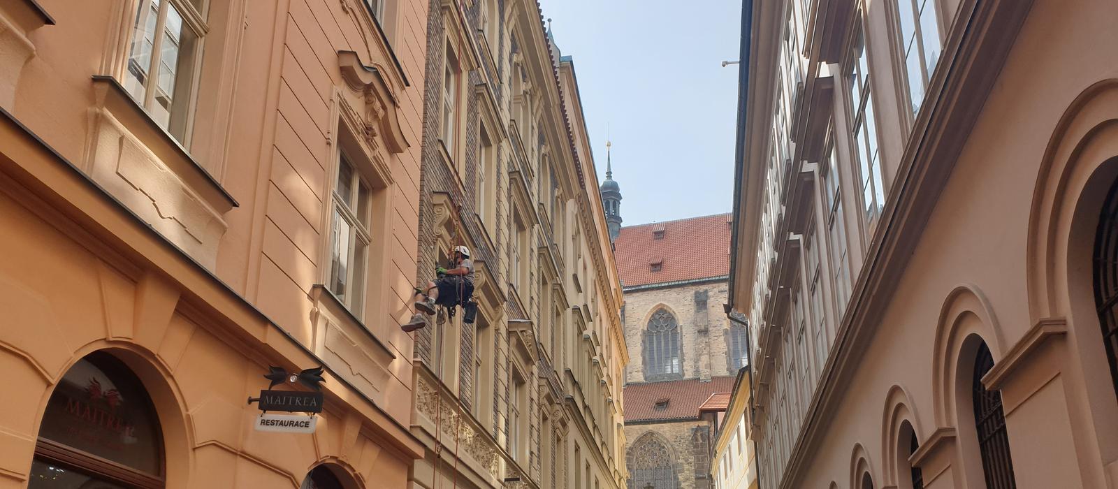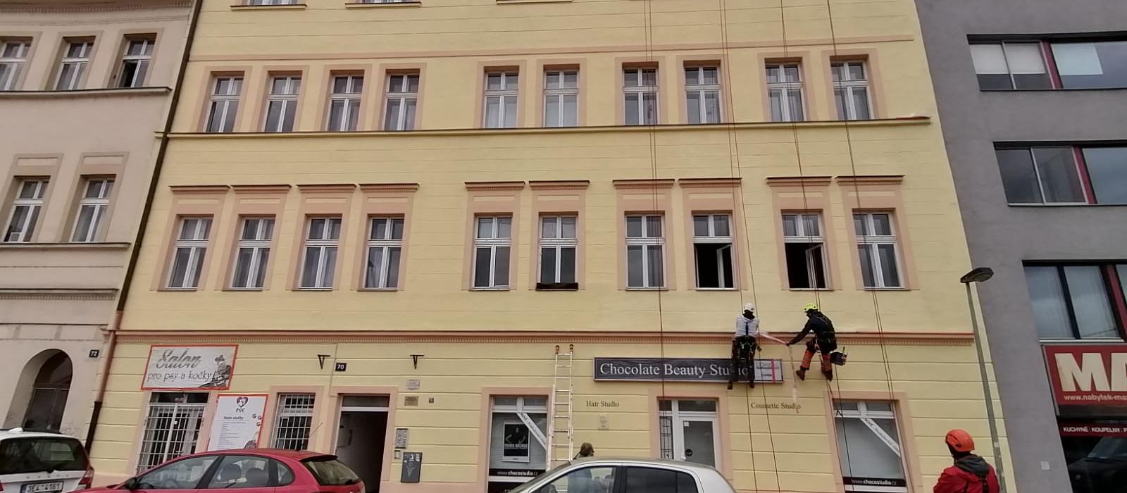 Provádíme certifikované práce ve výškách a nad otevřenou hloubkou za pomoci profesionální horolezecké techniky. Práce za pomoci horolezecké techniky je podstatně méně nákladná a efektivnější než práce z lešení nebo vysokozdvižných plošin. Veškerá doprava materiálu i přístup probíhá z vnějšku budov za pomoci speciálního lanového vybavení.