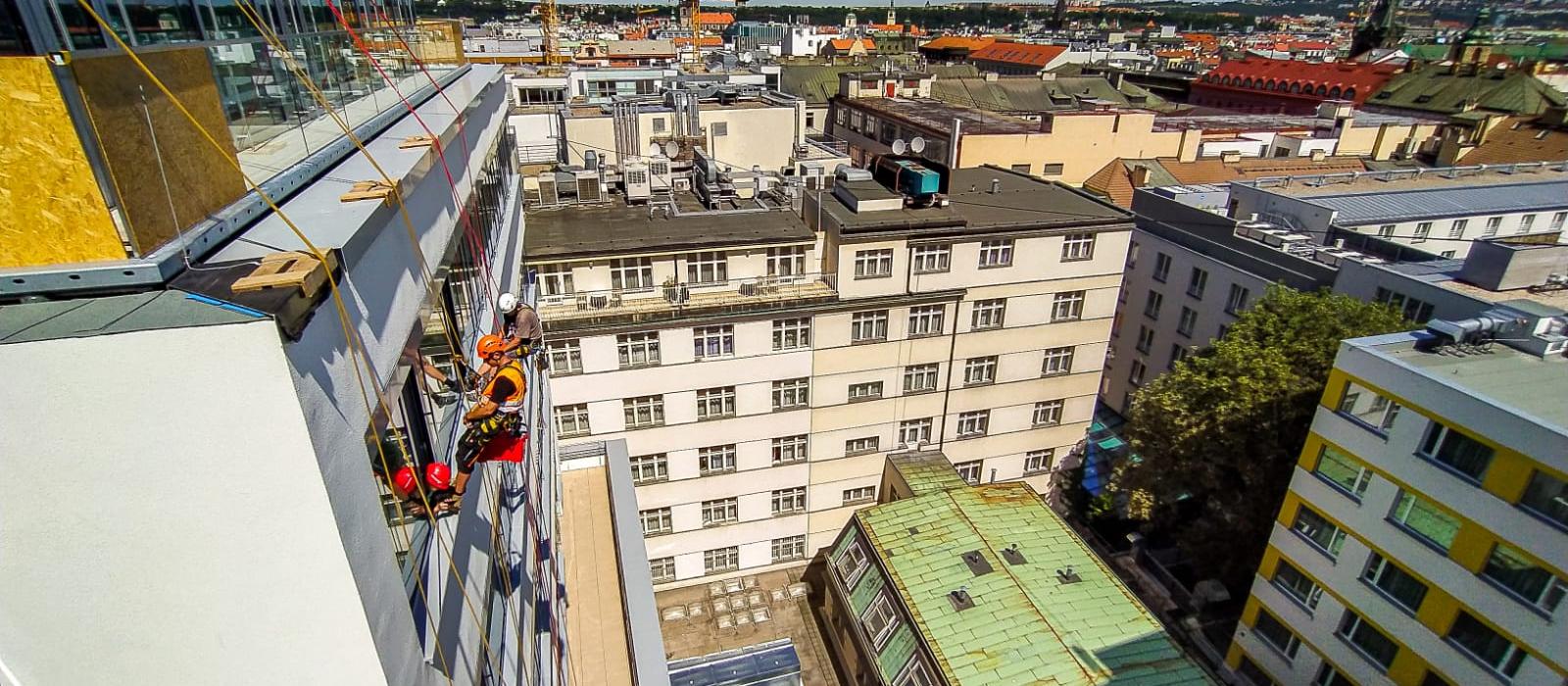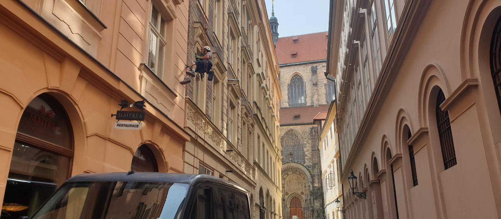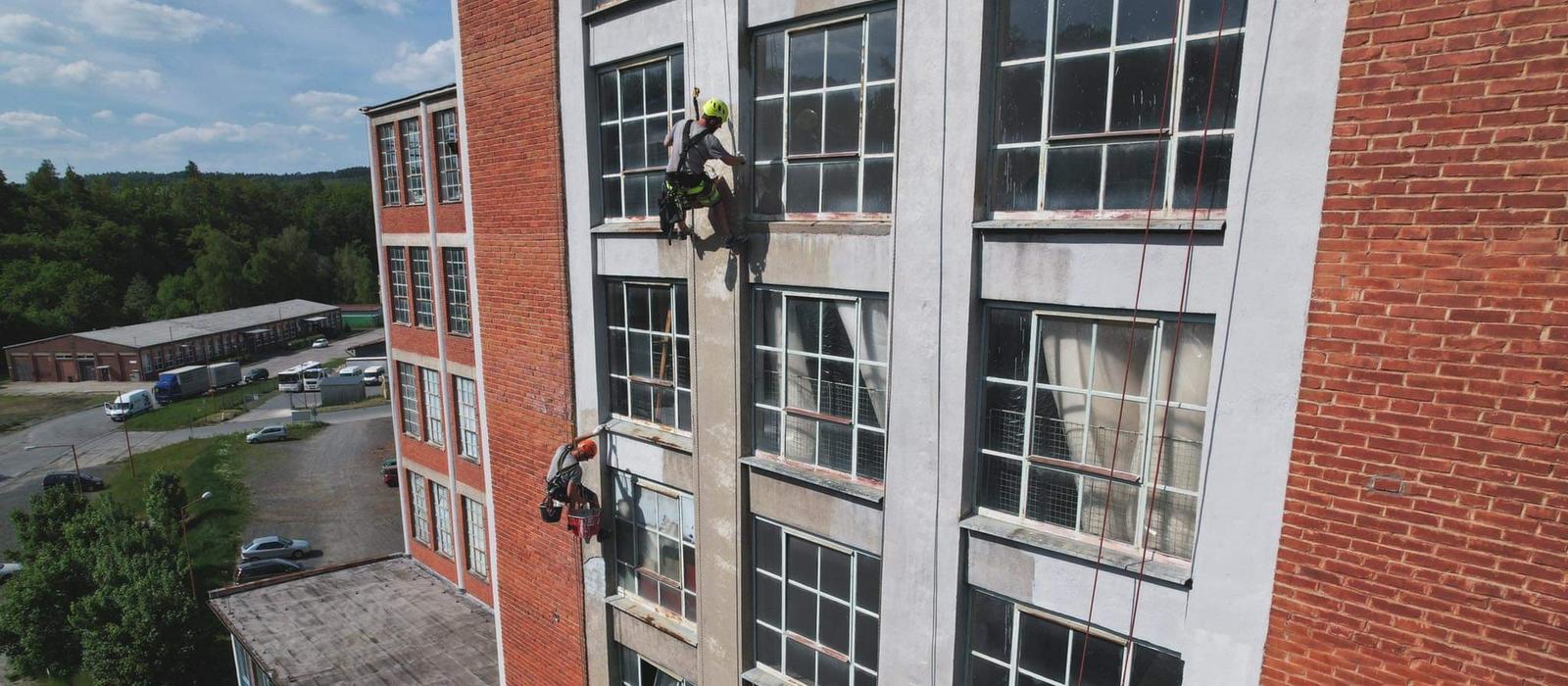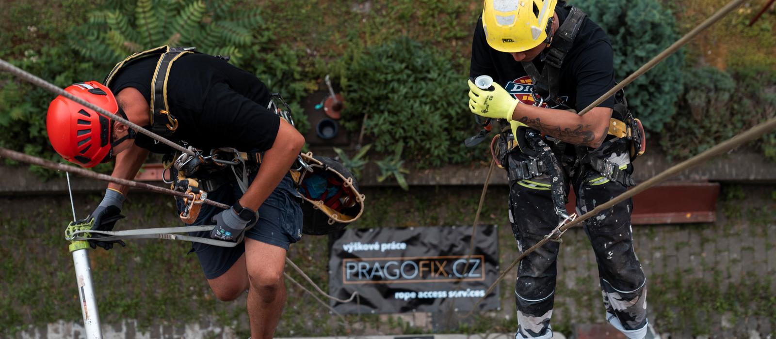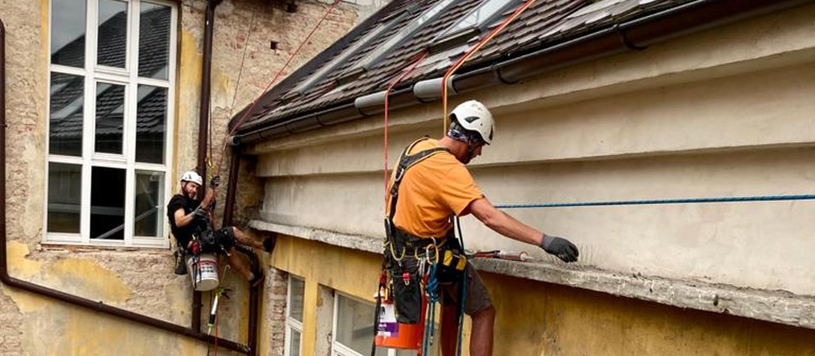 Provádíme certifikované práce ve výškách a nad otevřenou hloubkou za pomoci profesionální horolezecké techniky. Práce za pomoci horolezecké techniky je podstatně méně nákladná a efektivnější než práce z lešení nebo vysokozdvižných plošin. Veškerá doprava materiálu i přístup probíhá z vnějšku budov za pomoci speciálního lanového vybavení.