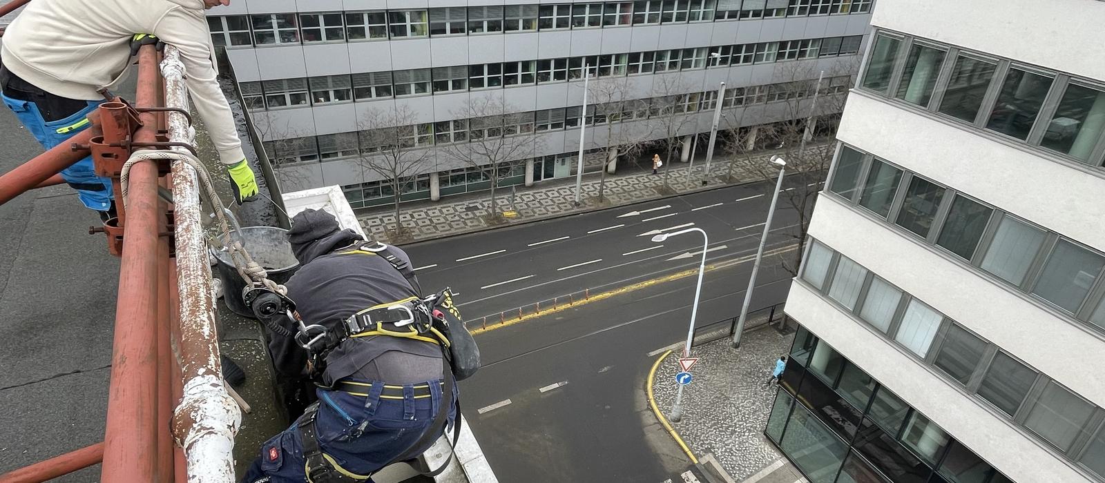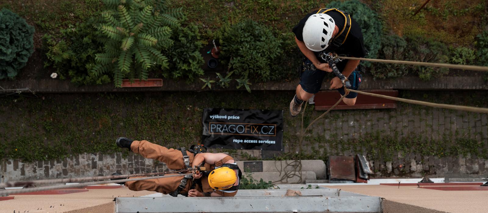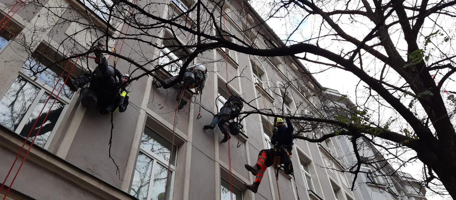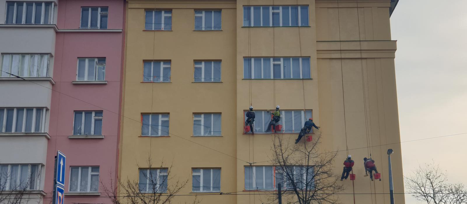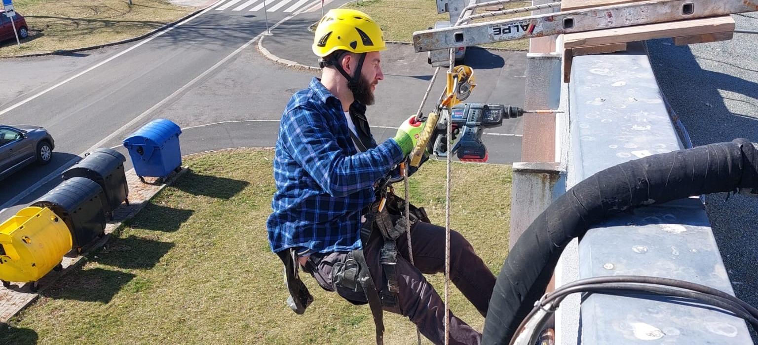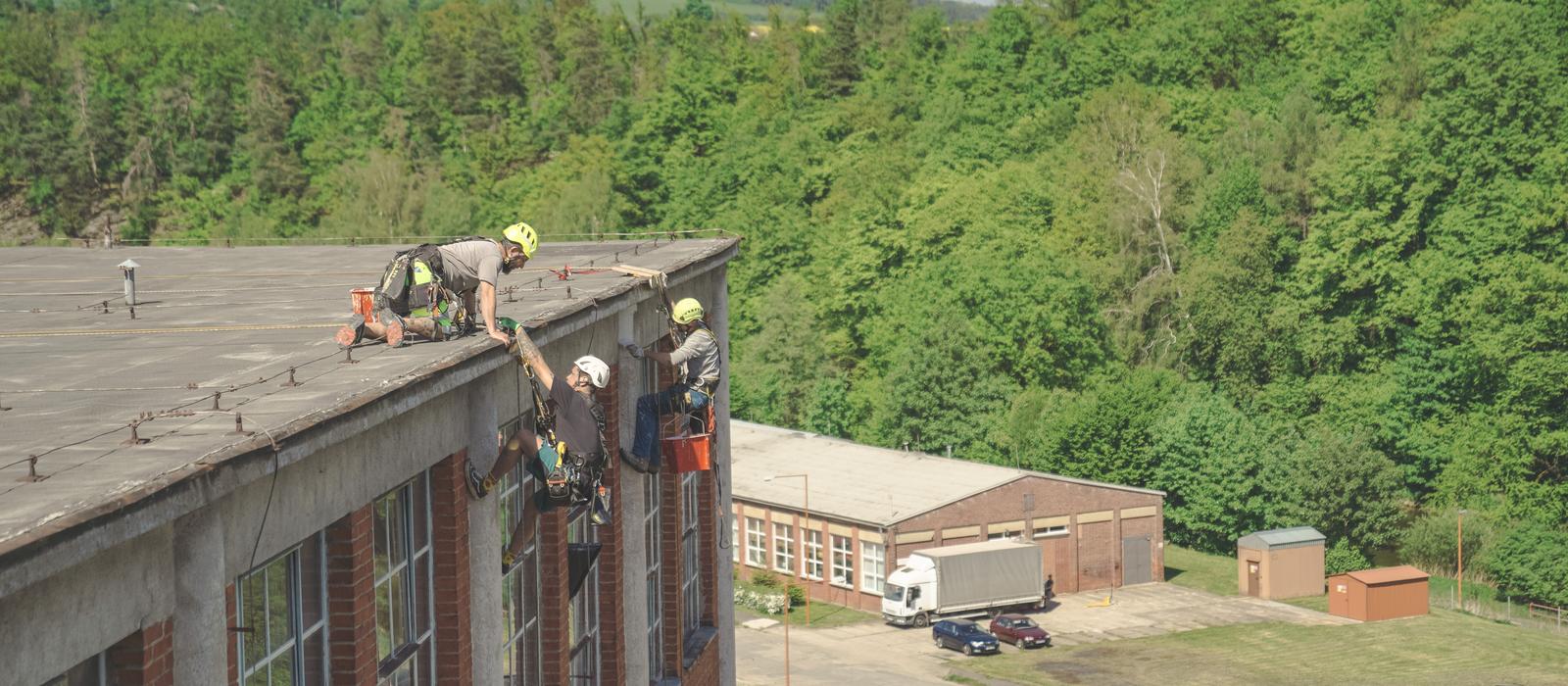 Provádíme certifikované práce ve výškách a nad otevřenou hloubkou za pomoci profesionální horolezecké techniky. Práce za pomoci horolezecké techniky je podstatně méně nákladná a efektivnější než práce z lešení nebo vysokozdvižných plošin. Veškerá doprava materiálu i přístup probíhá z vnějšku budov za pomoci speciálního lanového vybavení.