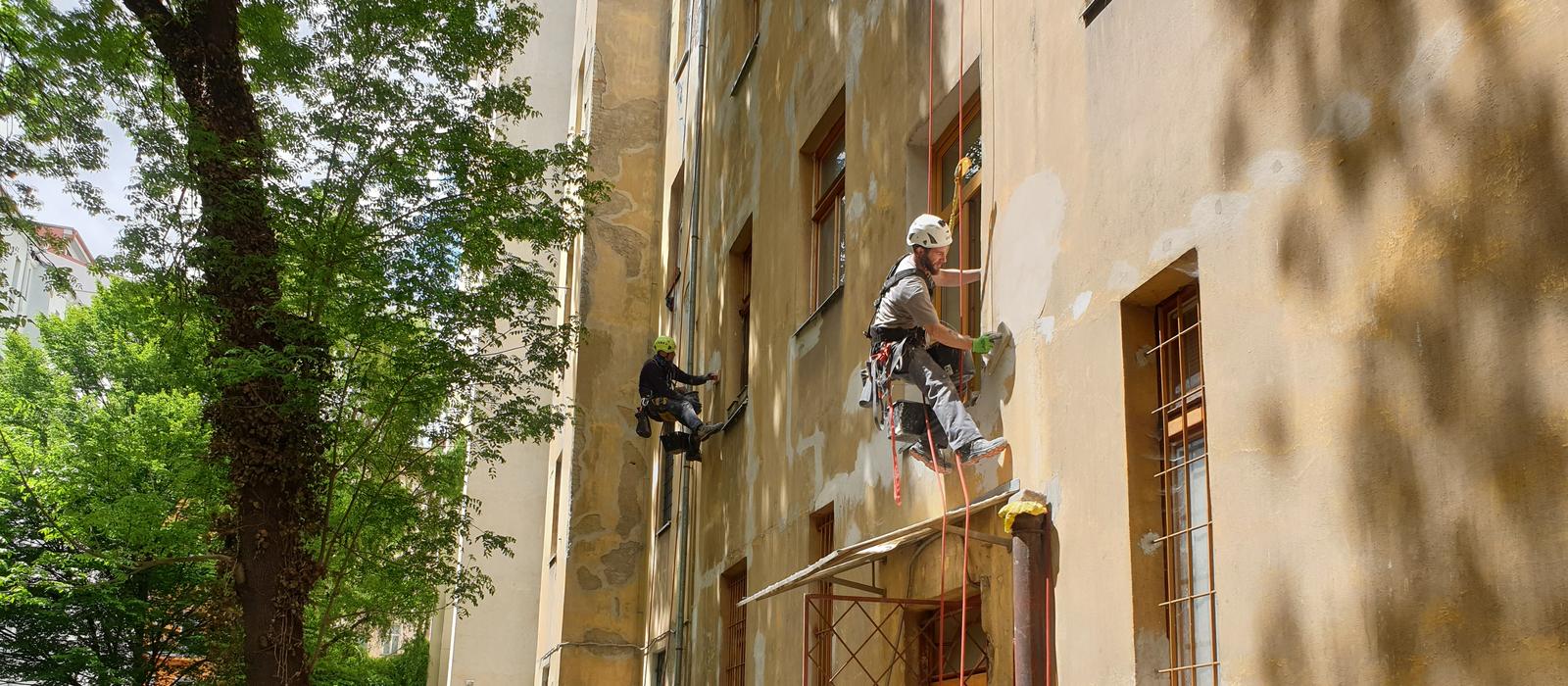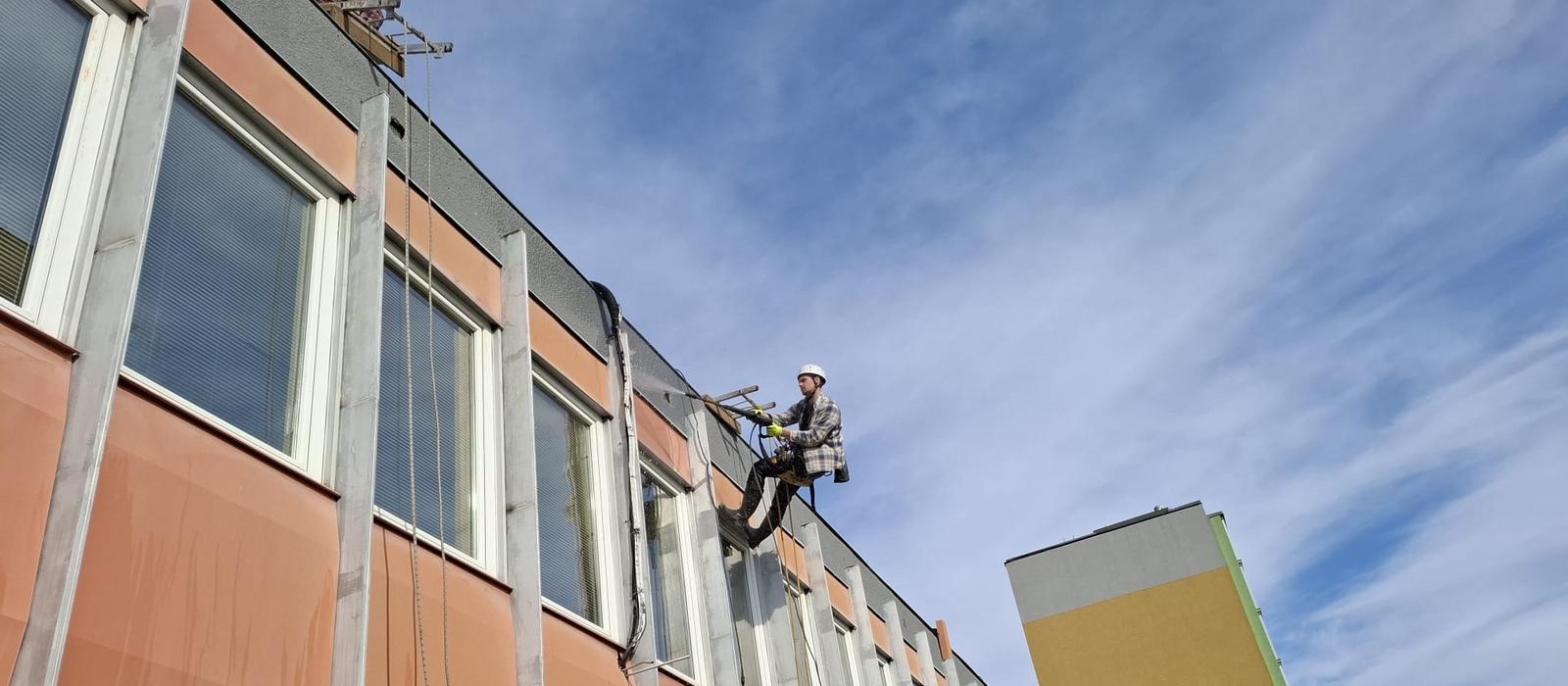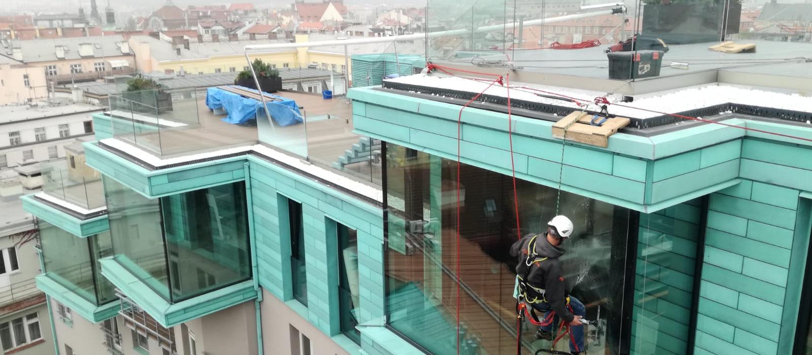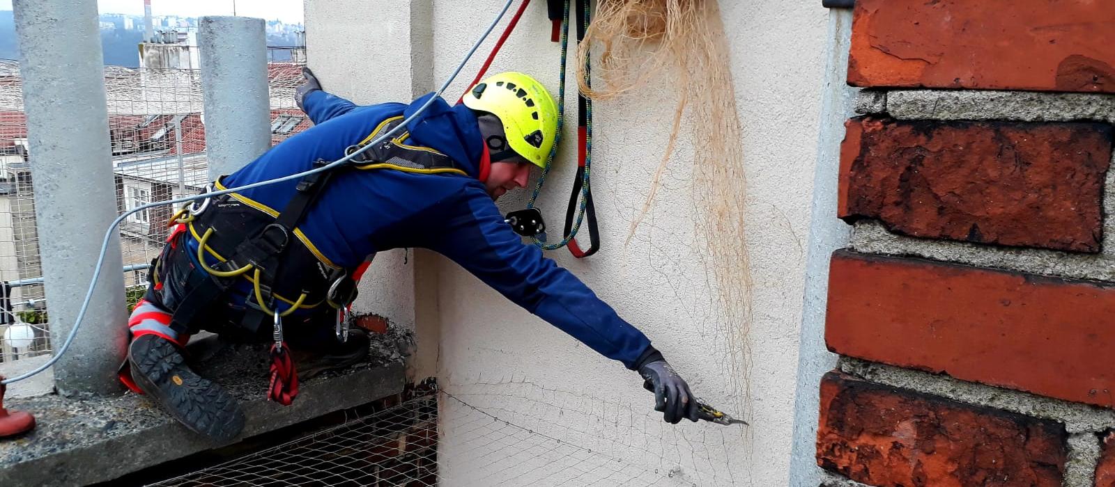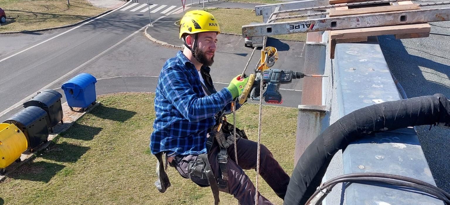 Provádíme certifikované práce ve výškách a nad otevřenou hloubkou za pomoci profesionální horolezecké techniky. Práce za pomoci horolezecké techniky je podstatně méně nákladná a efektivnější než práce z lešení nebo vysokozdvižných plošin. Veškerá doprava materiálu i přístup probíhá z vnějšku budov za pomoci speciálního lanového vybavení.